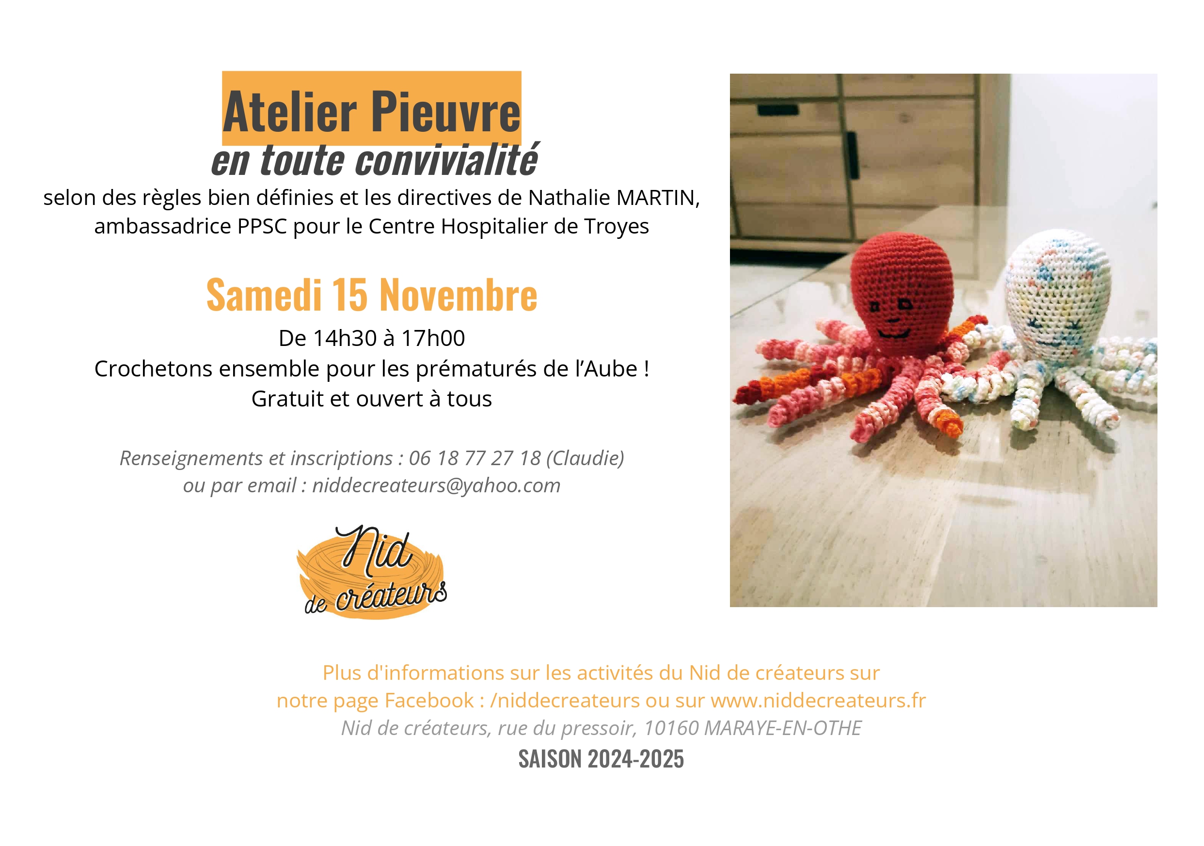 De 14h30 à 17h, Nathalie Martin, ambassadrice PPSC* pour le Centre Hospitalier de Troyes, vous apprendra à réaliser des pieuvres, qui seront ensuite remises au service des prématurés.